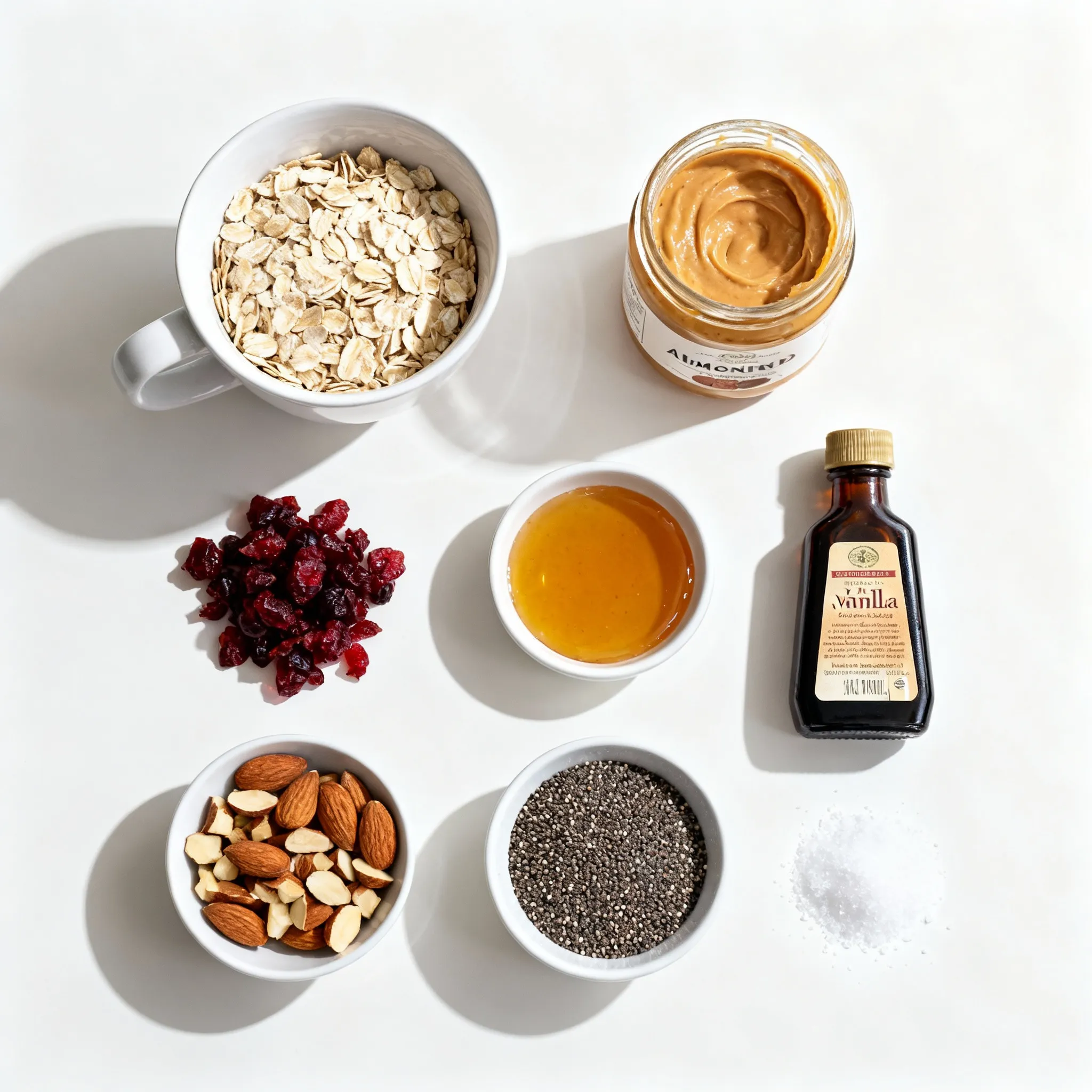 Each ingredient plays a role in creating a tasty snack. Rolled oats give a hearty base, while almond butter adds creaminess. Honey or maple syrup brings natural sweetness. Dried cranberries add a chewy burst of flavor. Chopped raw almonds provide crunch, and chia seeds boost nutrition. Lastly, vanilla extract and sea salt enhance all the flavors.