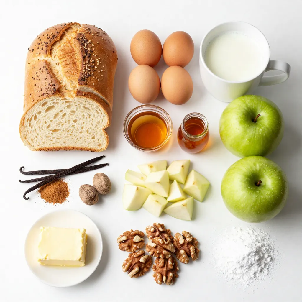 To make a great Apple Cinnamon French Toast Bake, gather these ingredients. Start with thick bread. I love using challah or brioche, as they soak up the custard well. You need three large eggs for a rich base. Whole milk and heavy cream add creaminess.