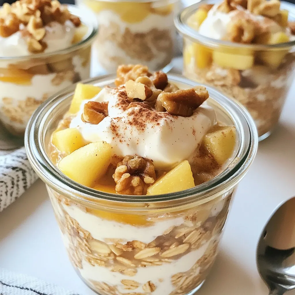 The right ingredients make all the difference in your apple pie overnight oats. Here’s what you need: - 1 cup rolled oats - 1 ¼ cups almond milk - 1 medium tart apple (e.g., Granny Smith) - 1 tablespoon maple syrup or honey - 1 teaspoon ground cinnamon - ½ teaspoon nutmeg - 1 tablespoon chia seeds - ¼ cup Greek yogurt or a dairy-free yogurt - 2 tablespoons walnuts, chopped (optional) - 1 tablespoon raisins (optional) This mix creates a tasty base with yummy textures. The oats will soak up the flavors overnight. The tart apple adds a nice zing. The spices bring warmth and comfort. Chia seeds add fiber and a little crunch. Greek yogurt gives creaminess and protein. You can switch things up, too! Use honey instead of maple syrup or leave out the nuts if you prefer. These oats are so easy to customize! {{ingredient_image_2}} In a medium bowl, I start by mixing together the rolled oats, almond milk, and sweetener. I use maple syrup for a touch of sweetness. Next, I add in the ground cinnamon, nutmeg, and chia seeds. This mix needs a good stir to blend all the flavors well. I want every bite to be rich and tasty. After the base is ready, I fold in the diced apples. I like to use a tart variety, like Granny Smith. It adds a nice zing. I make sure the apples spread evenly throughout the mixture. This way, each spoonful has a bit of apple goodness. Now it’s time to divide the mixture. I fill two jars, leaving space at the top for the oats to expand. On top, I add a scoop of Greek yogurt. It makes the oats creamy and adds protein. For extra crunch, I sprinkle in chopped walnuts and raisins. Next, I seal the jars tight. I place them in the fridge to chill overnight. This waiting time lets the flavors blend and the oats soften. In the morning, I simply grab a jar, give it a gentle stir, and enjoy my delicious apple pie overnight oats cold or warmed up. For the best apple pie overnight oats, soak them overnight. This allows the oats to absorb the milk and flavors, giving you a creamy texture. I recommend chilling them for at least five hours. This short wait makes all the difference. Use tart apples, like Granny Smith, for that authentic apple pie taste. Tart apples add a nice balance to the sweet and spicy flavors in the oats. Serve your oats in clear glass jars. This way, you can show off the beautiful layers. Top with a sprinkle of cinnamon and a thin slice of apple for a lovely finish. You can also add a dollop of Greek yogurt on top. For a complete meal, enjoy these oats with a warm cup of tea or coffee. You can easily make this recipe fit your needs. If you want it dairy-free, swap Greek yogurt for a plant-based yogurt. You can also skip the walnuts if you have nut allergies. For fun toppings, try adding fresh berries, a drizzle of peanut butter, or even seeds. These can add flavor and a nice crunch to your oats. Pro Tips Choose the Right Apples: Opt for tart apples like Granny Smith for a balanced flavor that complements the sweetness of the oats and maple syrup. Customize Your Toppings: Feel free to mix and match toppings such as nuts, seeds, or fresh fruit to suit your taste preferences and nutritional needs. Make It Vegan: Substitute Greek yogurt with a plant-based yogurt alternative to keep the recipe vegan while still providing creaminess. Prep in Bulk: Double or triple the recipe to have several jars ready for the week. Perfect for quick breakfasts on busy mornings! {{image_4}} You can switch up your apple pie overnight oats with fun flavors. Try seasonal spices like pumpkin spice for a fall twist. Berry mixes also work well. Just swap in your favorite berries with apples. This mix adds a fresh taste and bright color. You can also combine apples with other fruits. Try peaches or pears for a sweet change. Mixing flavors creates a new experience each time. Get creative and see what you enjoy! Reducing sugar can make your oats lighter. Use less maple syrup or honey for sweetness. You can also try natural sweeteners like stevia or monk fruit. Adding superfoods can boost nutrition. Flax seeds are a great option. They add fiber and healthy fats. Protein powder is another choice. It makes your oats more filling and helps with muscle recovery. Just a scoop is all you need. You can easily make your oats vegan. Instead of Greek yogurt, use plant-based yogurt. Almond or coconut yogurt works great. They give a creamy texture without dairy. To keep that creamy feel, use ripe bananas or avocados in place of yogurt. Just blend them into your oat mixture. This keeps your oats smooth and tasty while being dairy-free. Enjoy your vegan apple pie overnight oats! To keep your apple pie overnight oats fresh, use glass jars or airtight containers. These will help lock in moisture and flavor. Make sure the containers are clean and dry before filling them. To prevent spoilage, always seal the jars tightly. This keeps air out and stops bacteria from forming. Store your oats in the fridge at a temperature of 40°F or lower. Place them on a middle shelf for even cooling. You can enjoy your oats within three days. After that, the texture may change and they may not taste as good. If you want your oats warm, take a jar from the fridge. Remove the lid and stir the oats. Heat in the microwave for about one minute. Stir again to ensure even warmth. This keeps the flavors bright and tasty. If you prefer them cold, just dig in right away! Yes, you can. If you want a dairy-free option, use almond milk or coconut yogurt. You can also try silken tofu for creaminess. These swaps keep your oats tasty and healthy. You can store them for up to five days. Make sure to keep them in airtight jars. This keeps them fresh and tasty for your busy mornings. You can use quick oats, but the texture will change. Quick oats absorb liquid more quickly and become softer. If you like a creamier texture, quick oats work well. Yes, they are very healthy! Oats are full of fiber, which helps digestion. They also provide energy and keep you 