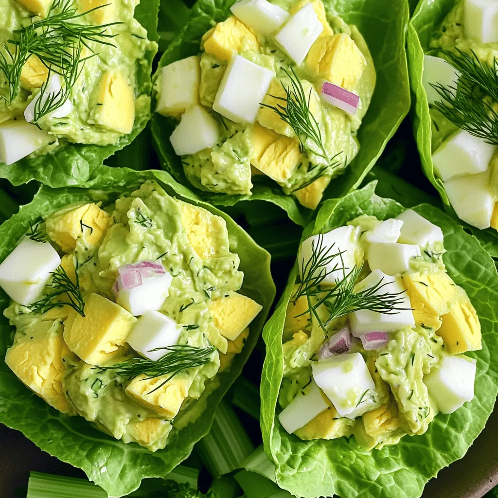 To make Avocado Egg Salad Lettuce Wraps, you need the following ingredients: - 4 hard-boiled eggs, peeled and roughly chopped - 1 ripe avocado, perfectly mashed - 2 tablespoons plain Greek yogurt for creaminess - 1 tablespoon Dijon mustard for a tangy kick - 1 tablespoon freshly squeezed lemon juice - ¼ cup red onion, finely chopped - ¼ cup celery, finely chopped - Salt and freshly ground black pepper to taste - 8 large leafy romaine or butter lettuce leaves - Fresh dill or parsley for garnish Each ingredient plays an important role. The eggs give protein, while the avocado adds a creamy texture. Greek yogurt boosts the creaminess and keeps it light. Dijon mustard adds a zesty flavor that contrasts nicely with the rich avocado. Lemon juice brightens the dish, making it fresh. Red onion and celery give a satisfying crunch. Lastly, the lettuce leaves serve as a great, low-carb wrap. Don't skip the herbs! Fresh dill or parsley can elevate the dish. They add a pop of color and a burst of flavor. You can adjust the seasoning to fit your taste. Enjoy making this vibrant and healthy meal! - Combine chopped eggs and mashed avocado in a bowl. - Incorporate Greek yogurt, Dijon mustard, and lemon juice. - Mix in chopped red onion and celery, and fold gently. In this step, you want the eggs to keep some texture. This adds a nice bite to your salad. The creamy avocado pairs well with the crunchy veggies. The Greek yogurt gives it a rich taste without too much fat. Dijon mustard adds a zing that wakes up all the flavors. A splash of lemon juice brings brightness to the mix. - Season to taste with salt and black pepper. - Prepare and dry lettuce leaves. - Spoon avocado egg salad into lettuce leaves. Once you mix everything, it's time to season. Just a pinch of salt brings out the flavors. Black pepper adds a little warmth. Rinse your lettuce leaves well and pat them dry. This keeps them crisp. Spoon your salad into each leaf. It’s like a little gift of flavor wrapped in greens. - Garnish with fresh dill or parsley. - Serve immediately or chill before serving. Adding fresh dill or parsley gives your wraps a pop of color and an extra layer of flavor. You can serve them right away for a fresh bite. If you prefer them cool, chill them for about an hour. This makes them even more refreshing. Enjoy your tasty and satisfying avocado egg salad lettuce wraps! To make the best avocado egg salad, use ripe avocados. They should feel soft but not mushy. Ripe avocados add rich flavor and a creamy texture. Adjust the seasoning to fit your taste. Some people like more salt or pepper, while others prefer it milder. Taste as you go to find the right balance. You can boost the flavor by adding spices. Paprika gives a nice smoky touch. Garlic powder adds depth and warmth. You can also mix in fresh ingredients. Diced tomatoes bring sweetness, while cucumbers add crunch. These extras make your wraps even more satisfying and fresh. Feel free to get creative with your favorite spices and additions! {{image_4}} You can make some easy swaps to lighten up this dish. First, try using low-fat Greek yogurt instead of the avocado. This will cut down on calories while still keeping the creaminess. If you want to reduce sodium, use low-sodium mustard instead of regular Dijon mustard. This way, you get all the flavor without the extra salt. While these lettuce wraps are tasty, you can enjoy the egg salad in other ways too. You can spread it on whole-grain toast for a hearty meal. Another option is to wrap it in whole-grain tortillas for an easy lunch. You can also serve the wraps with a side of mixed greens or crunchy veggie sticks. This adds color and nutrition to your plate. After making your avocado egg salad, store it in an airtight container. This keeps it fresh. You can keep your salad in the refrigerator for up to one day. The flavors stay bright, and the texture remains good. Just remember that the longer it sits, the more the avocado may darken. I do not recommend freezing this salad. Freezing changes the texture of the ingredients. The eggs and avocado will not taste fresh when thawed. It's best to enjoy this salad within a day of making it. This way, you get the best flavor and texture in every bite. Yes, you can! If you want to skip the eggs, try tofu. Silken tofu works well and gives a creamy texture. You can also use chickpea-based alternatives. Mash canned chickpeas with avocado for a similar taste. Both options keep the dish light and tasty. To make this dish vegan, swap the eggs for tofu or chickpeas. You can use mashed avocado to add creaminess. Replace Greek yogurt with a plant-based yogurt. This keeps your salad fresh and delicious without any animal products. These wraps pair well with fresh fruit. Think berries or sliced apples for sweetness. Whole grain chips also make a great side. They add a nice crunch and balance the meal. Enjoy your wraps with these tasty sides! This blog post shared a tasty avocado egg salad recipe with simple steps. You learned about key ingredients like eggs and avocado, plus tips for perfecting your dish. Remember, you can add spices or serve in wraps for variety. Store leftovers carefully, and try vegan options if desired. Enjoy your fresh and healthy meal with friends or family!