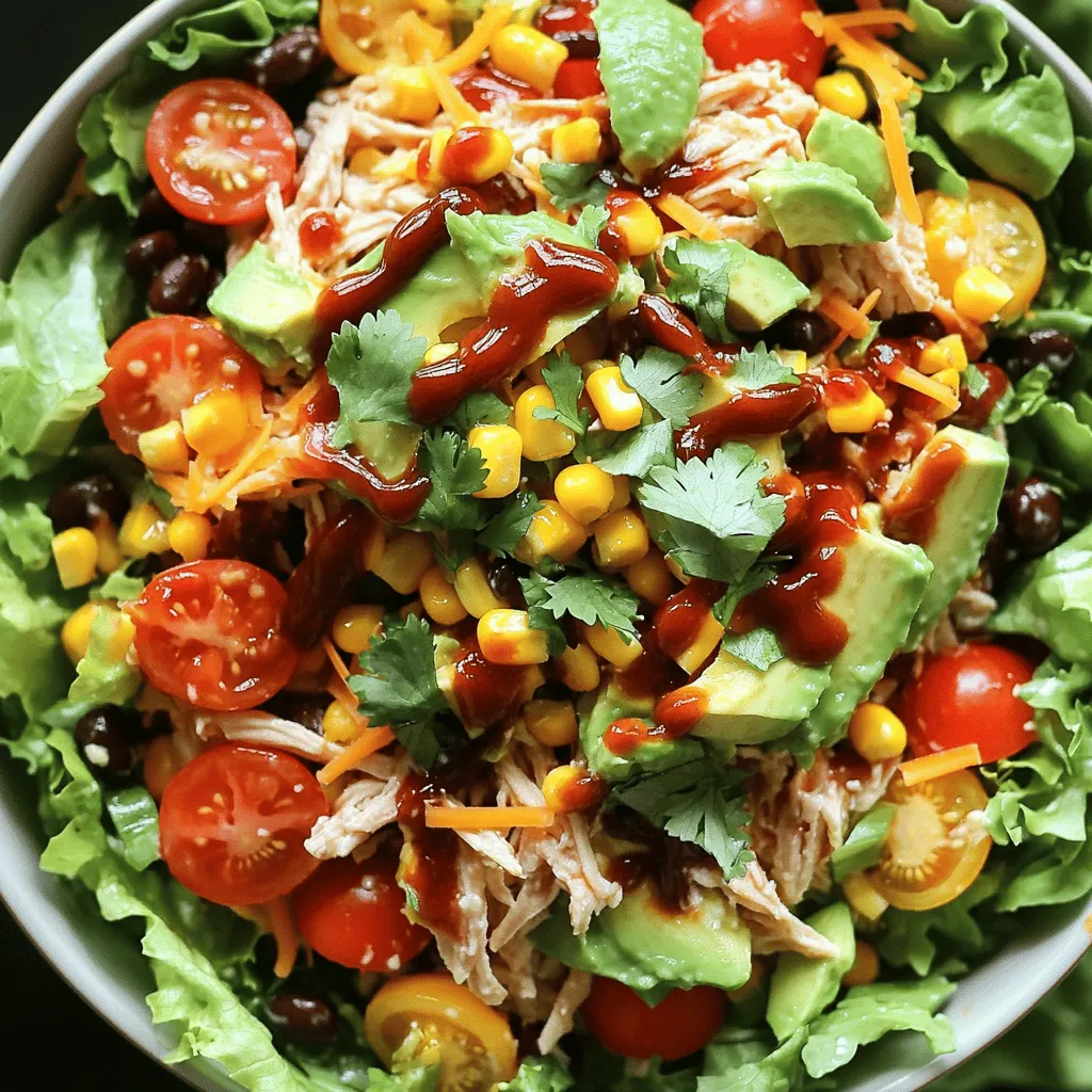 A well-presented salad grabs attention. Use large bowls or plates for serving. Start with a colorful layer of greens. Spread the BBQ chicken evenly on top. Arrange the other toppings artfully. This creates a feast for the eyes. Drizzle extra BBQ sauce and ranch dressing on top. Sprinkle fresh cilantro for a vibrant finish. Your guests will love the look and taste!