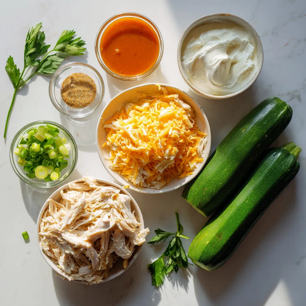 You need a few key items to make delicious buffalo chicken stuffed zucchini boats. Zucchini is the star of this dish. You also need cooked chicken, which you can shred easily. Buffalo sauce gives the dish its kick, while cream cheese adds creaminess. Cheddar cheese melts beautifully on top. Green onions add a fresh crunch.