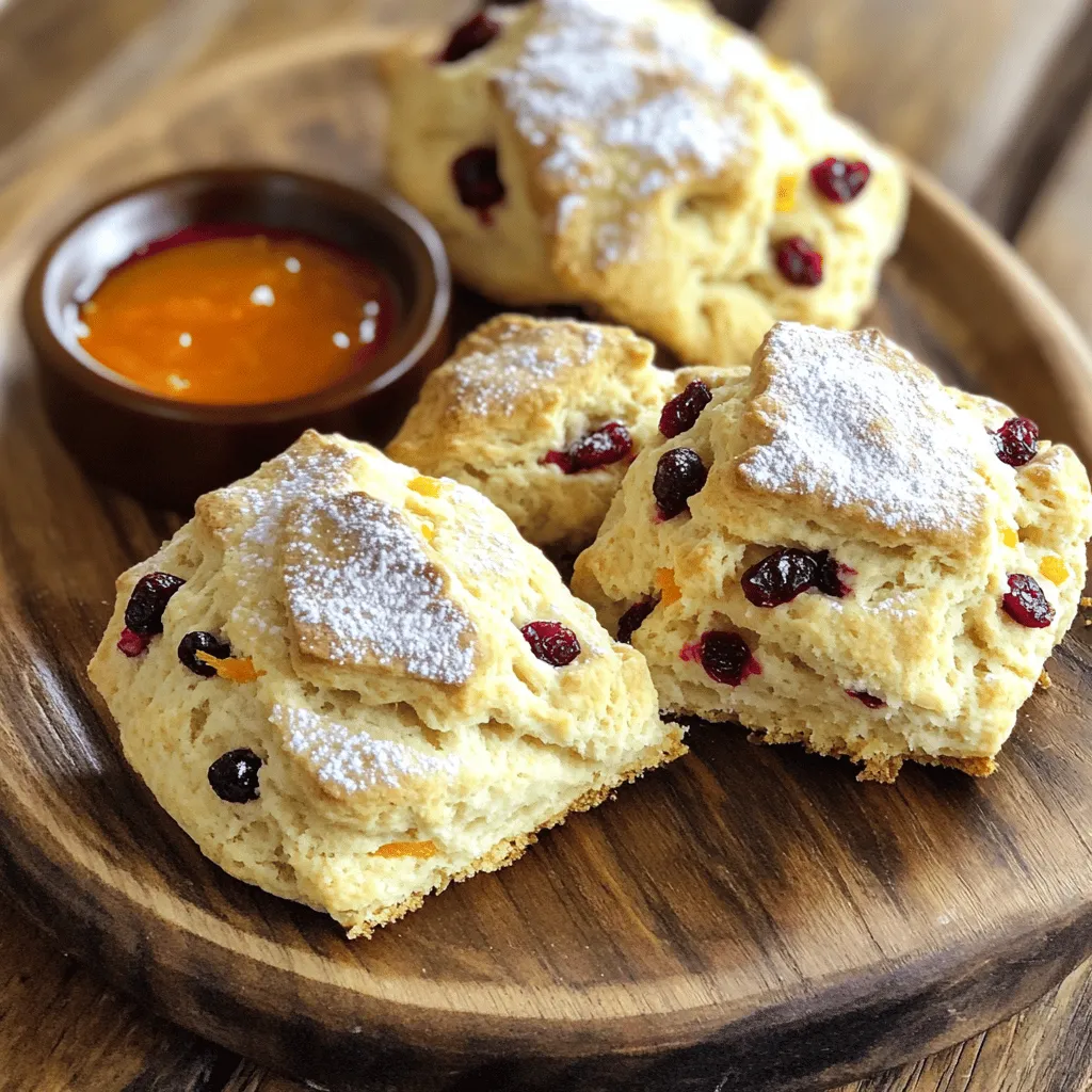 To make cranberry orange scones, you need some simple ingredients. Here’s the list: - 2 cups all-purpose flour - ⅓ cup granulated sugar - 1 tablespoon baking powder - ½ teaspoon salt - ½ cup unsalted butter, cold and cubed - ½ cup dried cranberries - Zest of 1 large orange - ½ cup whole milk - 1 large egg - 1 teaspoon pure vanilla extract Each ingredient plays a key role. The flour gives the scones structure. Sugar adds sweetness and helps with browning. Baking powder makes them rise, while salt brings out the flavors. Cold butter is essential. It creates flaky layers in the scones. Dried cranberries add a sweet and tart punch, and orange zest gives a bright, fresh flavor. Whole milk adds moisture. The egg helps bind everything together. Finally, vanilla extract adds a warm, inviting aroma. Gather these ingredients before you start. It makes the process smoother and more fun! First, set your oven to 400°F (200°C). This makes sure the scones bake evenly. Line a baking sheet with parchment paper. This helps the scones not stick. In a big bowl, mix 2 cups of all-purpose flour, ⅓ cup of granulated sugar, 1 tablespoon of baking powder, and ½ teaspoon of salt. Use a whisk to blend everything well. This creates a nice dry mix. Now, add ½ cup of cold, cubed unsalted butter. You can use a pastry cutter or your fingers. Mix until it looks like coarse crumbs. Some butter pieces should still be small. This keeps your scones tender. Next, gently fold in ½ cup of dried cranberries and the zest of 1 large orange. Make sure they are spread out evenly. This step adds bursts of flavor in each bite. In another bowl, whisk together ½ cup of whole milk, 1 large egg, and 1 teaspoon of pure vanilla extract. Mix until everything is combined. This adds moisture to your scones. Pour the wet mix into the dry mix. Stir gently until just combined. Don't overmix; it’s okay to have lumps. This will make the scones light and fluffy. Transfer the dough to a lightly floured surface. Knead it gently a few times. Then, pat it into a circle about 1 inch thick. This helps shape your scones. Use a sharp knife to cut the dough into 8 equal wedges. Place each wedge on the prepared baking sheet. Leave some space between them for even baking. Put the baking sheet in your preheated oven. Bake for about 15 to 20 minutes. The scones should be lightly golden and smell great when done. Once baked, take the scones out and let them cool on a wire rack for a few minutes. This helps set them and makes serving easier. Enjoy your warm scones! Mixing is key to great scones. Start by whisking the dry ingredients well. This helps blend them evenly. When you add the cold butter, use your fingertips or a pastry cutter. You want small bits of butter in the mix. This keeps the scones tender. Don’t rush this step. The more even your mix, the better your scones will be. To make fluffy scones, use cold ingredients. Cold butter and milk help create steam during baking. This steam makes the scones rise. Mix the dough just until combined. Overmixing can lead to dense scones. Lastly, shape the dough gently. Pat it down instead of rolling it out. This keeps air in the dough, making your scones light and airy. Serve your cranberry orange scones warm for the best taste. Dust them with powdered sugar for a sweet touch. You can also pair them with orange marmalade or clotted cream. These spreads add flavor and richness. Enjoy them with tea or coffee for a delightful snack. You can even serve them at brunch for a special treat! {{image_4}} You can mix up the dried cranberries with other fruits. Here are some great options: - Chopped dried apricots - Raisins or golden raisins - Dried cherries - Blueberries or blackberries These fruits give a sweet twist. They also add new flavors and colors. You can change the zest too. Lemon zest or lime zest adds a nice zing. To boost the flavor of your scones, try these ideas: - Add spices like cinnamon or nutmeg for warmth. - Use almond extract instead of vanilla for a unique taste. - Mix in chopped nuts, like walnuts or pecans, for crunch. These small changes make your scones even more special. You can find what you like best. If you need gluten-free scones, it's easy to swap ingredients. Use gluten-free all-purpose flour instead of regular flour. Make sure it has xanthan gum for texture. You can also try almond flour or coconut flour. These options will change the taste a bit. But they can still be delicious. Just be careful with the liquid amounts. Gluten-free flours often soak up more moisture. Adjust as needed for the perfect dough. To keep your leftover scones fresh, place them in an airtight container. This helps lock in moisture. You can store the scones at room temperature for up to two days. If you want to keep them longer, refrigeration is an option, but it may change their texture. When it's time to enjoy your scones again, you can reheat them. Preheat your oven to 350°F (175°C). Place the scones on a baking sheet and warm them for about 10 minutes. You can also use a microwave. Just heat them for about 15-20 seconds. This helps restore their soft texture. If you want to save scones for later, freezing is a great choice. Wrap each scone tightly in plastic wrap and then in aluminum foil. This prevents freezer burn. You can freeze them for up to three months. When you are ready to eat, thaw them in the fridge overnight and reheat as needed. Yes, you can use fresh cranberries. They will add a tart flavor to the scones. Fresh cranberries will make your scones slightly wetter. You may want to reduce the milk a bit to balance the moisture. You can use coconut oil or vegetable shortening in place of butter. Both will give a nice texture. If you use coconut oil, make sure it is solid, not melted. You can also try a plant-based butter for a dairy-free option. Your scones are done when they turn lightly golden on top. They should feel firm to the touch. If you insert a toothpick, it should come out c