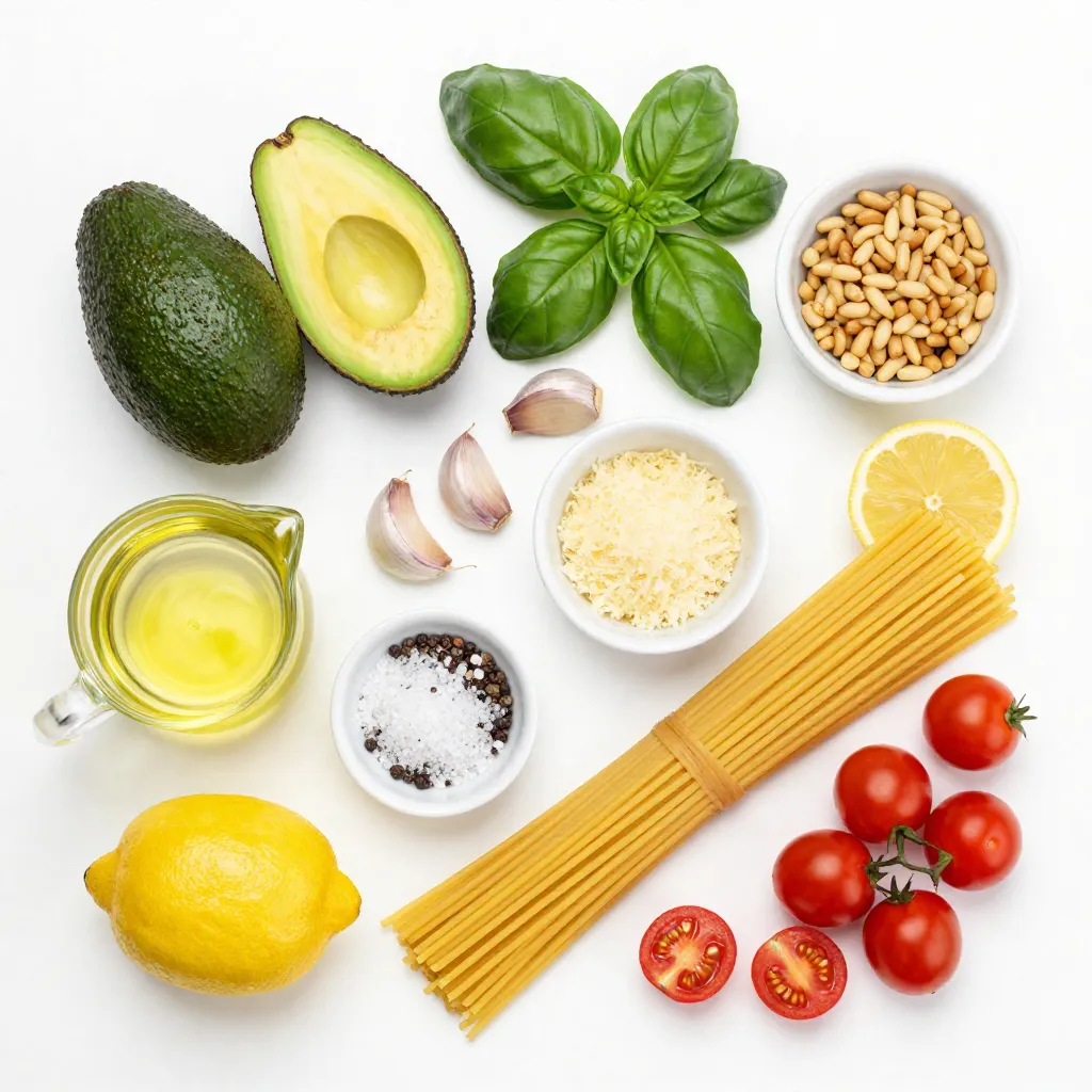 The ingredients for creamy avocado pesto pasta are simple yet vibrant. You need two ripe avocados. Their creaminess forms the base. Fresh basil leaves add a fragrant touch. Use tightly packed leaves for the best flavor. Pine nuts give a lovely crunch, but walnuts work too if you want a nutty flavor. Garlic adds a kick, while Parmesan cheese or nutritional yeast gives depth. Extra virgin olive oil makes the pesto smooth. The juice of one large lemon brightens the dish. Don’t forget salt and pepper to taste. Finally, spaghetti is the perfect pasta choice. Cherry tomatoes add color and freshness as a garnish.