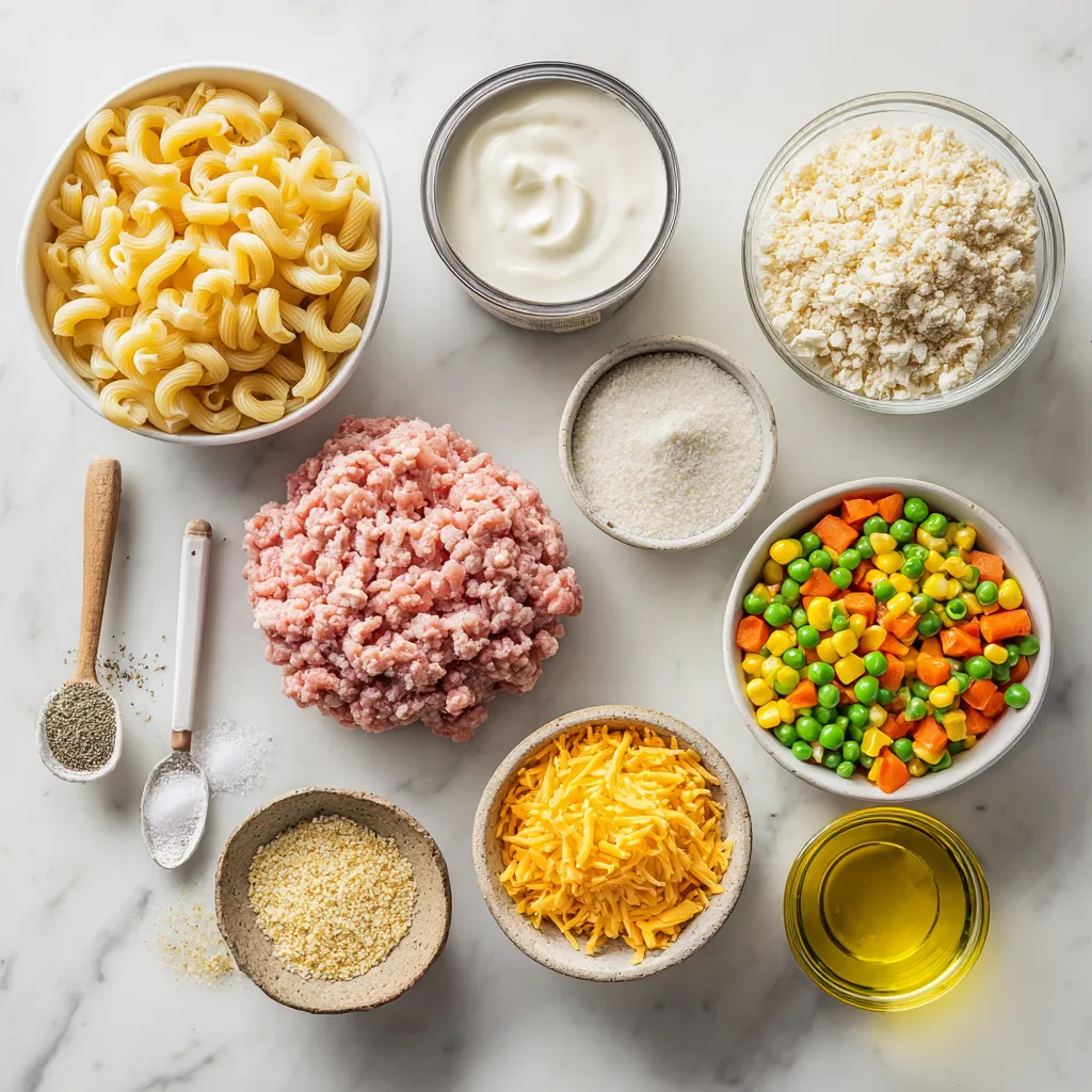 The main ingredients create a hearty base for the casserole. The ground turkey adds protein and flavor. Elbow macaroni gives it that comforting pasta feel. The cream of chicken soup brings in creaminess and helps bind everything together.