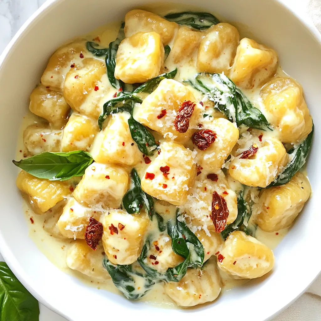 For this dish, you need: - 1 package (16 oz) potato gnocchi - 1 cup sun-dried tomatoes preserved in oil, drained and chopped - 1 tablespoon olive oil - 2 cloves garlic, finely minced - 1 cup heavy cream - 1 cup freshly grated Parmesan cheese - Salt and freshly cracked black pepper, to taste - 1 cup fresh spinach, roughly chopped - 1 teaspoon dried basil - Crushed red pepper flakes (optional, for a spicy kick) - Fresh basil leaves, for garnish To enhance the taste, consider these options: - Add a squeeze of lemon juice for brightness. - A pinch of nutmeg can add warmth. - Fresh herbs like parsley can bring freshness. Make sure you have: - A large pot for boiling water - A large skillet for cooking - A colander for draining gnocchi - A wooden spoon or spatula for stirring - A grater for the Parmesan cheese These tools help you create a smooth and tasty meal with ease. Enjoy cooking! {{ingredient_image_2}} Start by filling a large pot with water. Add a good amount of salt to it. Bring the water to a rapid boil. Once it boils, add the potato gnocchi. Cook until they float to the top, which takes about 2-3 minutes. This is how you know they are done. Drain the gnocchi in a colander and set aside. In a large skillet, pour in the olive oil. Heat it over medium heat until it warms up. Add the minced garlic and stir it for about 1 minute. You want to smell its nice aroma. Be careful not to let it burn; that can ruin the dish. After the garlic is fragrant, add the chopped sun-dried tomatoes. Cook for 2-3 minutes. This helps blend the flavors together. Reduce the heat to low now. Carefully pour in the heavy cream, stirring well to mix it with the garlic and tomatoes. Let it simmer gently for 2-3 minutes. This helps thicken the sauce a bit. Gradually add the grated Parmesan cheese while stirring. Keep mixing until the cheese melts and the sauce is smooth. It should be creamy and rich. Next, fold in the cooked gnocchi and chopped spinach. Add a pinch of salt, black pepper, and dried basil. Stir gently until the spinach wilts. Taste the sauce and adjust flavors as needed. Enjoy your creamy sun-dried tomato gnocchi! To make great gnocchi, start with salted water. Bring it to a gentle boil. Add the gnocchi and watch for them to float. This means they are done! It usually takes about 2-3 minutes. Once they float, drain them well. This step is key for a nice texture. If you overcook them, they will turn mushy. For a creamy sauce, use heavy cream. Heat it slowly to avoid burning. Always stir the cream as it heats. Gradually add Parmesan cheese. This helps it melt smoothly. If the sauce seems too thick, add a splash of pasta water. This will help create a silky finish without losing flavor. To boost flavor, add fresh spinach for color and nutrients. Dried basil adds a nice aroma. For a spicy kick, use crushed red pepper flakes. You can also mix in other veggies, like mushrooms or bell peppers. Experiment with different cheeses for a unique taste. Pro Tips Use Fresh Ingredients: Opt for fresh spinach and high-quality sun-dried tomatoes for the best flavor and texture in your dish. Perfect the Sauce Consistency: Keep the heat low when adding the cream to prevent it from curdling, ensuring a smooth and creamy sauce. Customize the Spice Level: Adjust the amount of crushed red pepper flakes based on your heat preference; start with a small pinch and add more if desired. Serve Immediately: This dish is best enjoyed fresh and hot, as the gnocchi and sauce can lose their texture if left to sit too long. {{image_4}} You can easily make this dish more veggie-friendly. Try adding: - Mushrooms: Sauté sliced mushrooms with garlic for extra flavor. - Zucchini: Add diced zucchini to the skillet. It cooks quickly and adds bulk. - Peas: Stir in fresh or frozen peas for a pop of sweetness. These additions keep the dish exciting and colorful. They also boost nutrition and taste. If you need a gluten-free option, look for gluten-free gnocchi. You can find it in stores or make your own. Here’s a simple way: - Use mashed sweet potatoes or riced cauliflower mixed with gluten-free flour. - Shape it into small dumplings and cook as usual. This keeps the dish delicious while accommodating dietary needs. For those who love spice, crushed red pepper flakes work wonders. Just sprinkle a pinch into the cream sauce. The heat balances the creaminess perfectly. If you like it spicier, add more flakes. Remember, taste as you go! This simple twist adds depth and excitement to your meal. Store leftover creamy sun-dried tomato gnocchi in an airtight container. Let it cool fully before sealing. This helps keep the flavors fresh. Place it in the fridge for up to three days. Make sure to label the container with the date for easy tracking. When reheating, use a skillet over low heat. Add a splash of cream or milk to keep it creamy. Stir gently while heating. This helps prevent sticking and ensures even warming. You can also use the microwave. Heat in short bursts, stirring in between. To freeze, let the dish cool completely. Use a freezer-safe container or bag. Separate portions for easy thawing later. It can last up to three months in the freezer. To use, thaw overnight in the fridge. Reheat in a skillet with a bit of cream for the best results. It takes about 25 minutes to make creamy sun-dried tomato gnocchi. First, you need 10 minutes to prep the ingredients. Then, the actual cooking takes around 15 minutes. This quick process allows you to enjoy a delicious meal in no time. You can use fresh tomatoes, but the flavor will change. Sun-dried tomatoes have a rich, concentrated taste. Fresh ones may not provide the same depth. If you use fresh tomatoes, try to roast them first for more flavor. You can use several substitutes for heavy cream. Options include whole milk with butter, coconut milk, or cashew cream. These alternatives can work well, but they may change the flavor and texture slightly. Traditional gnocchi is not gluten-free. It usua