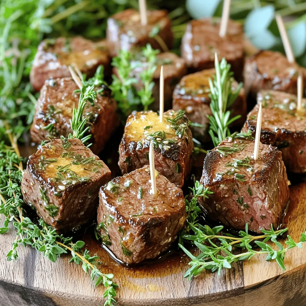 - 1 lb sirloin steak, cut into 1-inch cubes - 2 tablespoons olive oil - 4 tablespoons unsalted butter - 4 cloves garlic, finely minced - Fresh herbs: rosemary, thyme, parsley - Salt and pepper to taste - Additional fresh herbs for garnish - Suggestions for plating and presentation When you gather your ingredients, start with the main ones. The sirloin steak is key. Cut it into 1-inch cubes for quick cooking. This size helps the steak sear nicely, locking in flavor. Olive oil adds richness and helps the steak brown better. Now, let's talk about butter. Unsalted butter is perfect. It adds creaminess and depth to the dish. The garlic brings a punch of flavor. Finely mince four cloves to make sure the taste spreads evenly. For the herbs, use fresh rosemary, thyme, and parsley. They add vibrant flavors and aroma. Don't forget salt and pepper! They enhance the taste of your steak bites. For garnishing, fresh herbs look great on the plate. They also add a fresh taste. Think about how you want to present these bites. A simple plate with herbs and toothpicks makes a fun serving option. Or serve them with crusty bread to soak up the buttery sauce. Enjoy the process of cooking and savor every bite! To start, season the sirloin steak cubes with salt and black pepper. Use enough to coat each piece well. This helps the steak taste great. An even coating of seasoning is key. It ensures every bite has full flavor. Next, heat a large skillet. Pour in the olive oil and turn the heat to medium-high. Wait until the oil shimmers and is nearly smoking. This temperature is perfect for searing the steak. You want that nice brown crust on the outside. Now, add the seasoned steak bites to the skillet. Place them in a single layer, giving them space. This is important; overcrowding the pan makes it harder to sear. Cook each side for 2-3 minutes. Look for a rich brown color and your desired doneness. Once done, take the steak bites out and set them aside. In the same skillet, lower the heat to medium. Add the unsalted butter and minced garlic. Stir continuously for about one minute. You want the garlic to smell good but not brown. Timing here is crucial for the best flavor. Add the seared steak bites back into the skillet. Toss them with the garlic herb butter. Make sure every piece is coated well. Let them cook together for another minute. This helps the flavors mix and become richer. Finally, take the skillet off the heat. Move the garlic herb butter steak bites to a serving platter. For a nice touch, garnish with more fresh herbs. You can also serve them with toothpicks or crusty bread. This helps soak up all that tasty garlic herb butter. Enjoy your meal! To get that perfect sear, start with the right pan. Use a heavy skillet that holds heat well. Heat the pan over medium-high heat. Add olive oil once the pan is hot. It should shimmer but not smoke. Cook the steak bites in a single layer. If you overcrowd the pan, they won’t sear well. Sear each side for 2-3 minutes. This timing gives them a nice brown color. For doneness, check the meat with a thermometer. Aim for 130°F for medium-rare and 140°F for medium. Want to boost the flavor? Try adding more herbs like basil or oregano. A sprinkle of chili flakes gives it a nice kick. You can also switch up the steak. Cuts like ribeye or flank work well too. They add different tastes and textures. For sides, pair the steak bites with crispy fries or a fresh salad. A cold drink, like iced tea or a light beer, complements the meal well. For serving, use toothpicks for easy bites. You can also offer crusty bread to soak up the tasty garlic butter. {{image_4}} If you like spice, add chili flakes to the garlic herb butter. Start with a pinch. This gives a nice kick. You can also use hot sauce. Drizzle it over the finished dish for extra flavor. The heat balances well with the rich butter and garlic. You can swap steak for other proteins. Chicken works great. Cut it into bite-sized pieces and follow the same steps. Shrimp is another tasty option. Just make sure to cook it briefly to avoid overcooking. If you prefer a plant-based option, try tofu. Press it to remove extra water, then cube and cook as you would the steak. Want to mix it up? Try an Asian twist. Use ginger and soy sauce in your garlic butter. This gives a vibrant taste that pairs well with the steak. For a Mediterranean flavor, add feta cheese and olives. This combination brings a fresh and tangy touch to your dish. Each variation offers a new way to enjoy these steak bites. To store leftovers, place your steak bites in an airtight container. Ensure they cool completely before sealing. This helps to keep the meat juicy. You can store them in the fridge for up to three days. Label the container with the date to track freshness. When ready to eat, take out just what you need. If you want to save your steak bites for later, freezing is a great option. First, let them cool down. Then, spread the bites in a single layer on a baking sheet. Freeze them for about an hour. Once frozen, transfer the steak bites to a freezer-safe bag. Remove as much air as possible and label the bag with the date. Frozen steak bites can last for up to three months. When reheating, you want to keep the flavor and texture. For the best results, use a skillet. Heat it over medium heat and add a small amount of butter or oil. Once hot, add the steak bites. Stir gently for about five minutes or until heated through. This method helps to maintain the juicy taste. You can also reheat in the oven. Place them on a baking sheet and cover with foil. Heat at 350°F (175°C) for about ten minutes. Enjoy your flavorful meal! The best cuts for steak bites are sirloin and tenderloin. Sirloin is juicy and has great flavor. Tenderloin is very tender and melts in your mouth. Both cuts work well for this recipe. To keep steak tender, use these tips: - Choose the right cut. - Season well before cooking. - Don't overcook it; aim for medium-rare to medium. - 