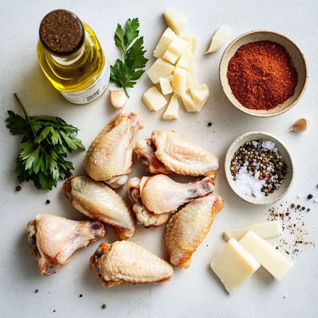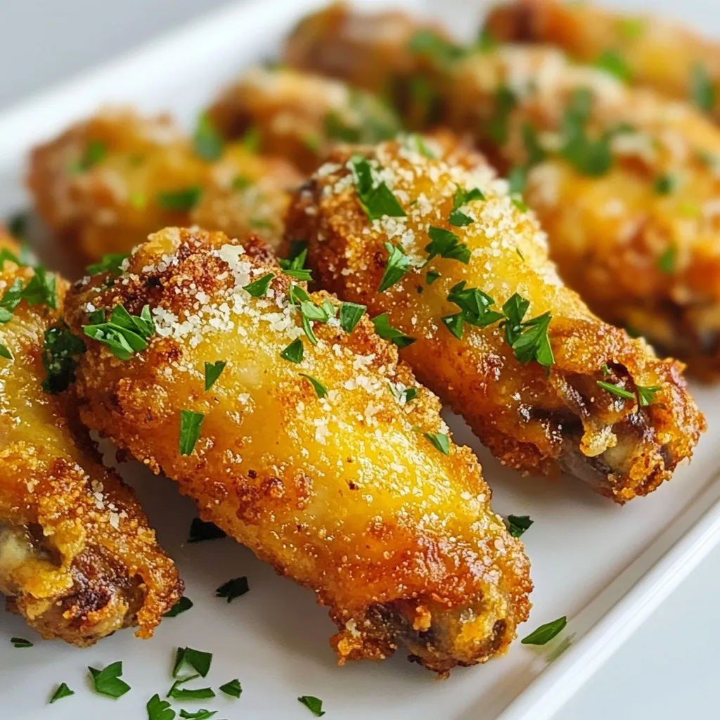 - 2 lbs chicken wings - 1 tablespoon olive oil - 1 teaspoon garlic powder - 1 teaspoon onion powder - 1 teaspoon smoked paprika - Salt and pepper to taste - ½ cup grated Parmesan cheese - 2 tablespoons fresh parsley, finely chopped (for garnish) To get the best taste from your wings, use fresh ingredients. Opt for high-quality chicken wings. The olive oil helps spices stick better. Always measure your spices carefully. Smoked paprika adds a rich, smoky flavor. Adjust salt and pepper to fit your taste. If you don’t have chicken wings, you can use drumsticks or thighs. For olive oil, you can use canola or avocado oil. Don’t have smoked paprika? Regular paprika works too, but it lacks the smoky taste. If you need a dairy-free option, skip the Parmesan or use a dairy-free cheese. {{ingredient_image_2}} 1. First, you want to preheat your air fryer to 400°F (200°C). This takes about 5 minutes. A hot air fryer makes your wings crispy. 2. Next, take a large mixing bowl. Add the chicken wings in it. Drizzle the olive oil over the wings. Toss them well so every wing gets coated. 3. Now, add the garlic powder, onion powder, smoked paprika, salt, and pepper. Toss again until the wings are well-seasoned. 4. It’s time to arrange the wings in the air fryer basket. Make sure to keep them in a single layer. Leave space between wings for even cooking. You may need to cook in batches. 5. Cook the wings for 25-30 minutes. Halfway through, shake the basket. This helps all wings cook evenly. They should be crispy with an internal temperature of at least 165°F (74°C). 6. After cooking, move the wings to a large bowl. While they are hot, sprinkle the grated Parmesan cheese over them. Toss gently to coat all wings evenly. 7. For a cheesy finish, put the wings back in the air fryer for 2-3 minutes. This melts the cheese just right. 8. Finally, take the wings out and garnish with fresh parsley. Serve them hot for the best taste. You need to cook the wings at 400°F (200°C) for 25-30 minutes. Remember to shake the basket halfway through. This ensures all wings get crispy and delicious. Check their internal temperature to be sure they reach 165°F (74°C). If your wings are not crispy, try these tips: - Too many wings in the basket: This can trap steam. Cook in smaller batches. - Not enough oil: A bit of oil helps with crispiness. Make sure to coat each wing. - Cooking time: If they seem undercooked, add a few more minutes. You want that perfect crunch! By following these steps, you will create crispy, flavorful Garlic Parmesan wings that impress everyone. Enjoy the process and your delicious wings! To get wings that are super crispy, start with dry wings. Pat them with paper towels. This helps remove extra moisture. Next, use olive oil. It helps the seasoning stick and adds flavor. Make sure to space the wings out in the air fryer. Crowding them can lead to soggy wings. Cook at 400°F for 25-30 minutes. Shake the basket halfway through. This ensures even cooking and crispiness. Try adding lemon zest for a bright kick. You can also mix in chili powder for heat. If you want a tangy twist, add a splash of vinegar to the olive oil. Fresh herbs like thyme or rosemary can also boost flavor. For a richer taste, use aged Parmesan instead of fresh. Be creative and taste as you go for the best flavor. Serve your wings on a big platter. Line it with parchment paper for easy cleanup. Offer extra Parmesan cheese in a small bowl. Lemon wedges add a zesty touch. You can also pair them with a creamy dip like ranch or blue cheese. For a fun twist, add some crunchy veggies on the side. Enjoy your wings hot for the best taste! Pro Tips Pat Dry: Before seasoning, ensure the wings are pat dried with paper towels. This helps achieve maximum crispiness during cooking. Batch Cooking: If your air fryer is small, cook in batches to avoid overcrowding. This allows hot air to circulate properly around each wing. Flavor Variations: Consider adding different spices or hot sauce to the seasoning mix for varied flavor profiles. Experiment with your favorite spices! Resting Time: Let the wings rest for a few minutes after cooking before serving. This helps the juices redistribute, making them juicier. {{image_4}} You can change up the flavor of your wings easily. Instead of garlic powder, try using lemon pepper for a zesty kick. If you want heat, add cayenne pepper or chili powder. For a sweet twist, mix in some brown sugar with the spices. You can also use Italian herbs like oregano or thyme for an herby touch. These changes keep your meal exciting and tasty. Dipping sauces add fun to your wings. A classic ranch or blue cheese dressing pairs well with the garlic and cheese. You can also try a spicy buffalo sauce for a fiery bite. If you prefer a sweet option, honey mustard works great too. Experiment with different sauces to find your favorite combo. If you have dietary needs, you can adapt this recipe. For gluten-free wings, make sure your spices are certified gluten-free. If you're looking for a dairy-free option, use nutritional yeast instead of Parmesan cheese. You can also bake the wings instead of air frying if you don’t have an air fryer. These simple swaps let everyone enjoy crispy wings. To store leftover wings, let them cool first. Place them in an airtight container. You can keep them in the fridge for up to three days. Make sure to separate layers with parchment paper to avoid sticking. To reheat, place wings in the air fryer at 350°F (175°C). Heat them for about 5-7 minutes. This method keeps them crispy. You can also use an oven if you prefer. Just bake at 350°F (175°C) for about 10 minutes. If you want to freeze wings, first let them cool completely. Arrange them in a single layer on a baking sheet. Freeze until solid, then transfer them to a freezer bag. Write the date on the bag. They can last up to three months in the freezer. When ready to eat, thaw in the fridge before reheating. Cook wings in an air fryer fo
