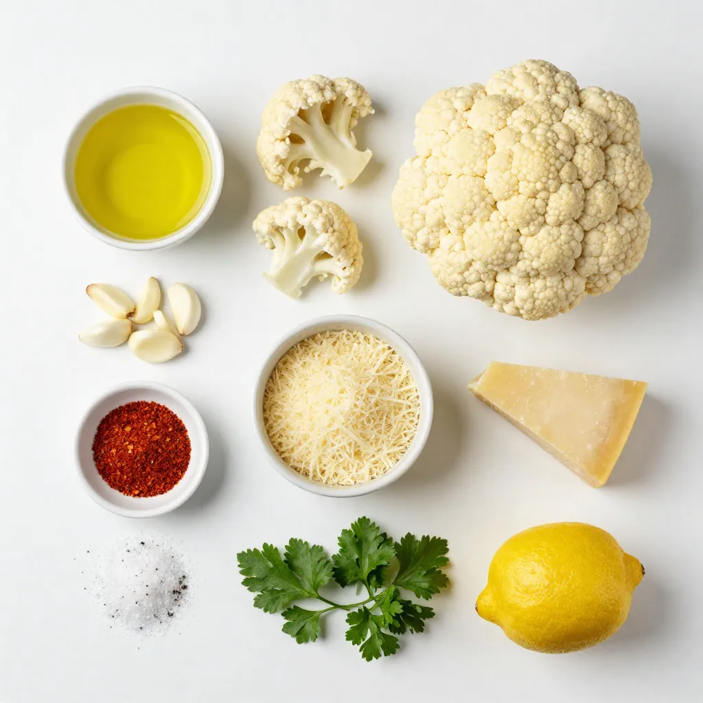 To make Garlic Parmesan Roasted Cauliflower, gather your ingredients first. Start with a medium head of cauliflower. Cut it into bite-sized florets. This will help them cook evenly.