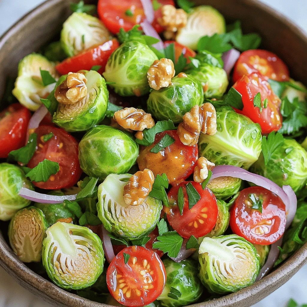 Once the Brussels sprouts are cool, I move to a large bowl. Here, I combine the blanched sprouts, halved cherry tomatoes, and thinly sliced red onion. I make sure to mix them well for a balanced salad. Next, I drizzle the honey mustard dressing over everything. I gently toss the salad to coat all the ingredients. Then, I fold in the toasted walnuts. This adds a nice crunch. Finally, I season with salt and freshly ground black pepper to taste. I let the salad sit for about 10 minutes. This helps the flavors blend before I serve it. Just before I serve, I sprinkle fresh parsley on top for extra color.