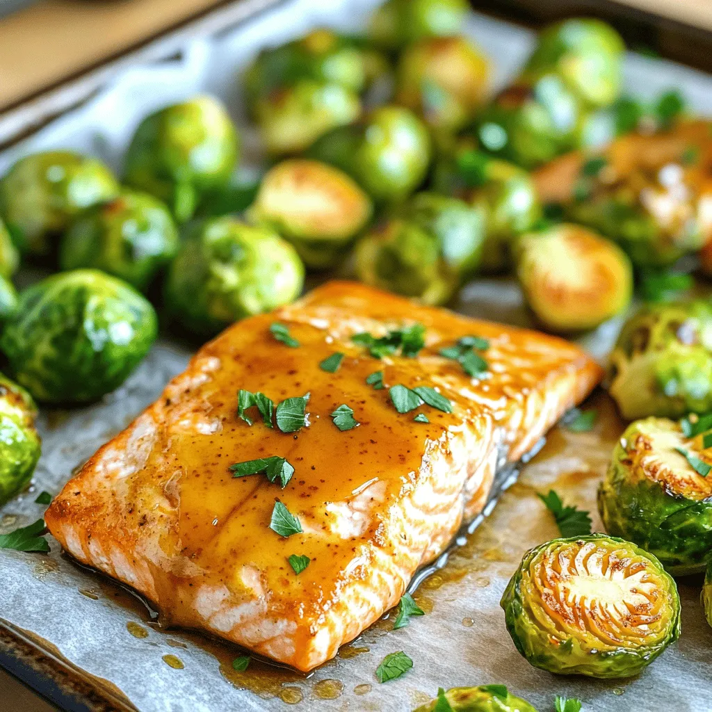 - 4 salmon fillets (6 oz each) - 2 cups Brussels sprouts, halved - ¼ cup pure maple syrup - 2 tablespoons Dijon mustard - 1 tablespoon olive oil (plus extra for Brussels sprouts) - 2 cloves garlic, minced - Salt and black pepper, to taste - 1 teaspoon smoked paprika (optional) - Fresh parsley, chopped, for garnish Gathering the right ingredients is key for this dish. Salmon fillets are rich in flavor and healthy fats. Brussels sprouts add a nice crunch and earthiness. The maple syrup gives a sweet glaze that balances the fish perfectly. For the glaze, I use Dijon mustard. It adds a tangy bite that blends well with the maple syrup. Olive oil helps the mixture coat the salmon and veggies nicely. Garlic enhances the flavor, making each bite pop. When seasoning, I like to use salt and black pepper. They bring out the best in every ingredient. Smoked paprika can add a nice hint of smoke if you want. Finally, I always finish the dish with fresh parsley. It adds color and a fresh taste. - Preheat your oven to 400°F (200°C). - Line a large baking sheet with parchment paper. This makes cleanup easy. - In a medium mixing bowl, combine: - ¼ cup pure maple syrup - 2 tablespoons Dijon mustard - 2 cloves garlic, minced - 1 tablespoon olive oil - Salt and black pepper, to taste - 1 teaspoon smoked paprika (optional) - Whisk these ingredients together until smooth. This glaze adds a sweet and savory touch. - Place the halved Brussels sprouts on one side of the baking sheet. - Drizzle a bit of olive oil over them. - Season with salt and black pepper, then toss well. - On the other side, arrange the 4 salmon fillets, skin-side down. - Brush the glaze generously over each fillet. Save a little glaze for later. - Slide the baking sheet into the oven. Bake for 15-20 minutes. - Salmon is done when it flakes easily with a fork. Brussels sprouts should be tender and caramelized. - For the last 2-3 minutes, switch to broil. This adds a nice finish. Watch closely to avoid burning. - Carefully take out the baking sheet from the oven. - Drizzle the reserved glaze over the salmon fillets for extra flavor. - Sprinkle freshly chopped parsley on top for a bright garnish. To cook salmon just right, aim for an internal temperature of 145°F. This ensures it is safe to eat. To check, use a food thermometer. The salmon should flake easily with a fork when done. When broiling, keep a close eye on the fish. Place it about six inches from the heat. This helps caramelize the glaze and adds a nice finish. Broil for just 2-3 minutes. Be patient; it can burn quickly! For the best Brussels sprouts, cut them in half to help them cook evenly. Trim the ends and remove any yellow leaves. Toss them with olive oil, salt, and pepper. This simple mix brings out their natural flavor. You can also roast, steam, or sauté Brussels sprouts. Roasting gives them a nice crunch. Steaming keeps them tender, while sautéing adds a quick char. Choose a method based on your preference! For serving, you can keep things rustic by using the baking sheet. Just serve the salmon and Brussels sprouts right from it. This looks warm and inviting. If you want a fancier look, plate each piece separately. Drizzle extra glaze on top and sprinkle with fresh parsley. This adds color and freshness. You can even use a squeeze of lemon for a bright touch! {{image_4}} You can change the flavor of this dish easily. Adding citrus zest, like lemon or orange, brightens the glaze. Just a teaspoon of zest can make a big difference. It adds a fresh taste that pairs well with salmon. You can also try different types of mustard. Honey mustard adds sweetness, while whole grain mustard gives a nice crunch. Each choice brings a unique twist to the dish. If you want to switch up the protein, try using trout or tilapia. Both cook well and taste great with maple glaze. They offer a mild flavor that works perfectly. For veggies, feel free to swap Brussels sprouts with asparagus or green beans. These alternatives roast nicely and add color to your plate. Want a different method? You can grill the salmon. Just make sure to coat it well with the glaze. Cooking it on a grill gives a smoky flavor that is delicious. An air fryer is another option. It cooks the salmon quickly and keeps it moist. Adjust the cooking time to about 10-15 minutes. Keep an eye on it to avoid overcooking. To keep your Maple Glazed Salmon and Brussels sprouts fresh, store leftovers in an airtight container. Refrigerate them right away. This will help maintain flavor and texture. You can keep the dish in the fridge for up to three days. If you notice any off smells or changes in color, it's best to throw it away. When it's time to enjoy your leftovers, you have a few options. You can reheat the salmon in the oven at 350°F for 10-15 minutes. This method keeps the fish moist. You can also use the microwave. Use low power and heat in short bursts. For the Brussels sprouts, try to sauté them in a pan. This helps keep their crispness. If you want to save some for later, freezing is a good option. First, let the dish cool completely. Then, wrap the salmon and sprouts tightly in plastic wrap. Place them in a freezer-safe bag or container. You can freeze them for up to three months. When you're ready to eat, thaw the dish in the fridge overnight. Reheat in the oven as mentioned before. This will help you enjoy a tasty meal even after some time! Bake salmon for 15 to 20 minutes at 400°F. The salmon is done when it flakes easily with a fork. It should be opaque and no longer look raw. If you like a bit of crisp on top, broil for the last 2-3 minutes. Yes, you can use frozen salmon. Just thaw the fillets in the fridge overnight. If you're short on time, you can also thaw them in cold water for about an hour. Pat them dry before baking to help the glaze stick. You can serve this dish with several sides. Try a fresh salad or roasted potatoes. Quinoa or rice also pairs well. For a veggie boost, add steamed green beans or a 