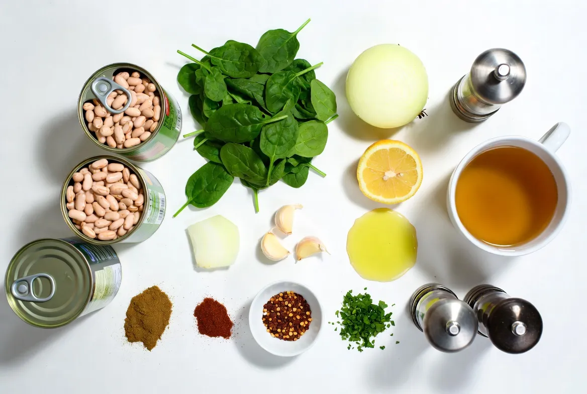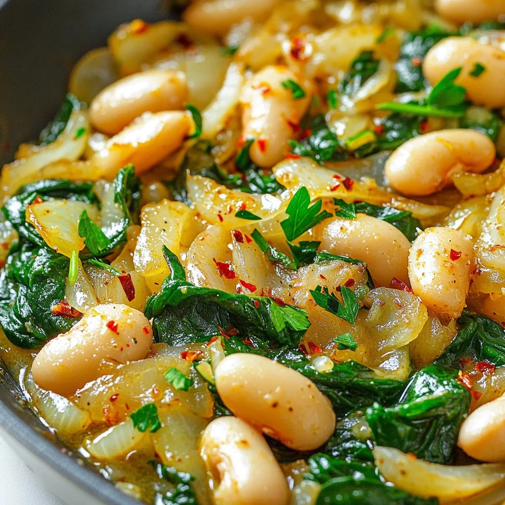 This dish brings together simple yet flavorful ingredients. The white beans offer a creamy texture. They serve as the heart of the dish. Fresh spinach adds a bright green color and nutrients. The yellow onion and garlic build a savory base.