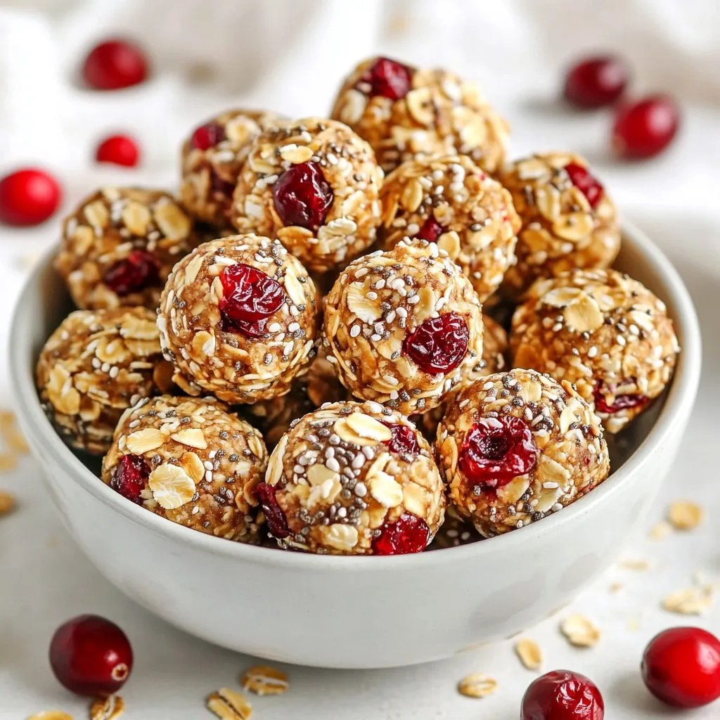 To make almond cranberry energy bites, gather these ingredients: - 1 cup almond butter - 1 cup rolled oats - ½ cup dried cranberries, roughly chopped - ½ cup honey or maple syrup - ¼ cup unsweetened coconut flakes - ¼ cup chia seeds - 1 teaspoon pure vanilla extract - ¼ teaspoon fine sea salt These ingredients blend together to create a nutritious, tasty snack. Almond butter provides healthy fats and protein. Rolled oats give a hearty texture and fiber. Dried cranberries add a sweet and tangy flavor. Honey or maple syrup sweetens the mix naturally. Unsweetened coconut flakes bring a tropical twist. Chia seeds boost the nutrition with omega-3s. Pure vanilla extract adds a warm, inviting aroma. Fine sea salt enhances all the flavors, making every bite delightful. Having these ingredients ready makes the process easy and fun. You can find them at most grocery stores. If you have any dietary needs, feel free to swap out some items. Enjoy making these energy bites! {{ingredient_image_2}} 1. Mixing almond butter and sweetener Start by taking a big bowl. Add 1 cup of almond butter and ½ cup of honey or maple syrup. Use a spatula to mix until it is smooth. This is your base. 2. Adding vanilla and sea salt Next, pour in 1 teaspoon of pure vanilla extract. Then, add ¼ teaspoon of fine sea salt. Stir well to blend the flavors. This adds depth to your bites. 3. Incorporating dry ingredients Now, slowly add 1 cup of rolled oats, ¼ cup of chia seeds, and ¼ cup of unsweetened coconut flakes. Keep mixing until everything is combined. This gives your bites texture and nutrition. 4. Folding in chopped cranberries Carefully add ½ cup of roughly chopped dried cranberries. Gently fold them into the mixture. Make sure they are spread out but not crushed. You want sweet pops in every bite. 5. Chilling the mixture Once mixed, cover the bowl with plastic wrap. Place it in the fridge for about 30 minutes. This helps the mixture firm up and makes it easier to shape. 6. Rolling into bite-sized balls After chilling, take the bowl out. Scoop small amounts of the mixture with your hands. Roll them into balls about 1 inch wide. This makes them easy to grab and eat. 7. Setting in the refrigerator Place your rolled energy bites on a baking sheet lined with parchment paper. Put them back in the fridge for another hour. This helps them set and hold their shape. 8. Storage Once firm, transfer the energy bites to an airtight container. They can last in the fridge for up to one week or be frozen for longer. Enjoy your healthy snacks anytime! - Use room temperature ingredients: Keep your almond butter and sweetener at room temperature. This makes mixing much easier and helps create a smooth texture. - Choose the right sweetener: Honey offers a floral taste, while maple syrup gives a rich flavor. Pick what you like best for the energy bites. - Adjust sweetness levels: Taste the mixture before rolling. If you want it sweeter, add more honey or maple syrup. - Arrange bites for visual appeal: Use a small bowl or a nice plate to show off your energy bites. A neat layout makes them look even more tasty. - Garnishing ideas for serving: Sprinkle extra dried cranberries and coconut flakes around the bites. This adds color and makes your dish pop! Pro Tips Chill for Easy Handling: Allowing the mixture to chill for 30 minutes makes it easier to roll into bites without sticking to your hands. Customize Your Sweetness: Adjust the amount of honey or maple syrup based on your taste preference or dietary needs. Boost Nutritional Value: Add nuts or seeds of your choice, such as walnuts or pumpkin seeds, for extra crunch and nutrition. Storage Solutions: Keep energy bites in an airtight container in the fridge for up to a week or freeze them for longer storage without losing freshness. {{image_4}} You can easily change the nut butter in this recipe. Almond butter is great, but peanut butter works well too. Cashew butter is another tasty option. All these nut butters provide creaminess and flavor. You can also switch up the dried fruits. If you don’t have cranberries, try raisins or chopped apricots. Each fruit adds its own unique taste and sweetness to the bites. This way, you can tailor the recipe to your liking. To make your energy bites even more exciting, add some spices. A sprinkle of cinnamon can warm up the flavors. Nutmeg also brings a nice twist. Just a dash of either will make a big difference. You can also mix in dark chocolate chips for a rich touch. The chocolate adds sweetness and pairs well with almond and cranberry. Plus, it makes these bites feel like a treat. You can enjoy them even more with these simple enhancements. To keep your almond cranberry energy bites fresh, store them in an airtight container. Place them in the refrigerator. They stay good for about one week. If you want to keep them longer, freezing is a great option. Just wrap each bite in plastic wrap. Then, put them in a freezer bag. This way, they can last for up to three months. When you're ready to eat, let them thaw in the fridge for a few hours. These energy bites are great on their own. You can also pair them with other snacks. Try serving them with yogurt or fresh fruit for a balanced treat. They make a perfect pick-me-up before or after workouts. If you want a fun snack mix, combine them with nuts and popcorn. This adds crunch and flavor. Enjoy your bites anytime you need a quick energy boost! Almond cranberry energy bites last about one week in the fridge. You can also freeze them for up to three months. Just store them in an airtight container to keep them fresh. Yes, you can easily make these energy bites vegan. Simply replace honey with maple syrup. This keeps them sweet and plant-based without losing flavor. If you do not have chia seeds, you can use flax seeds. Ground flax seeds work well and offer similar health benefits. You can also omit them if needed. Yes, these energy bites are healthy. They provide protein from almond butter and 