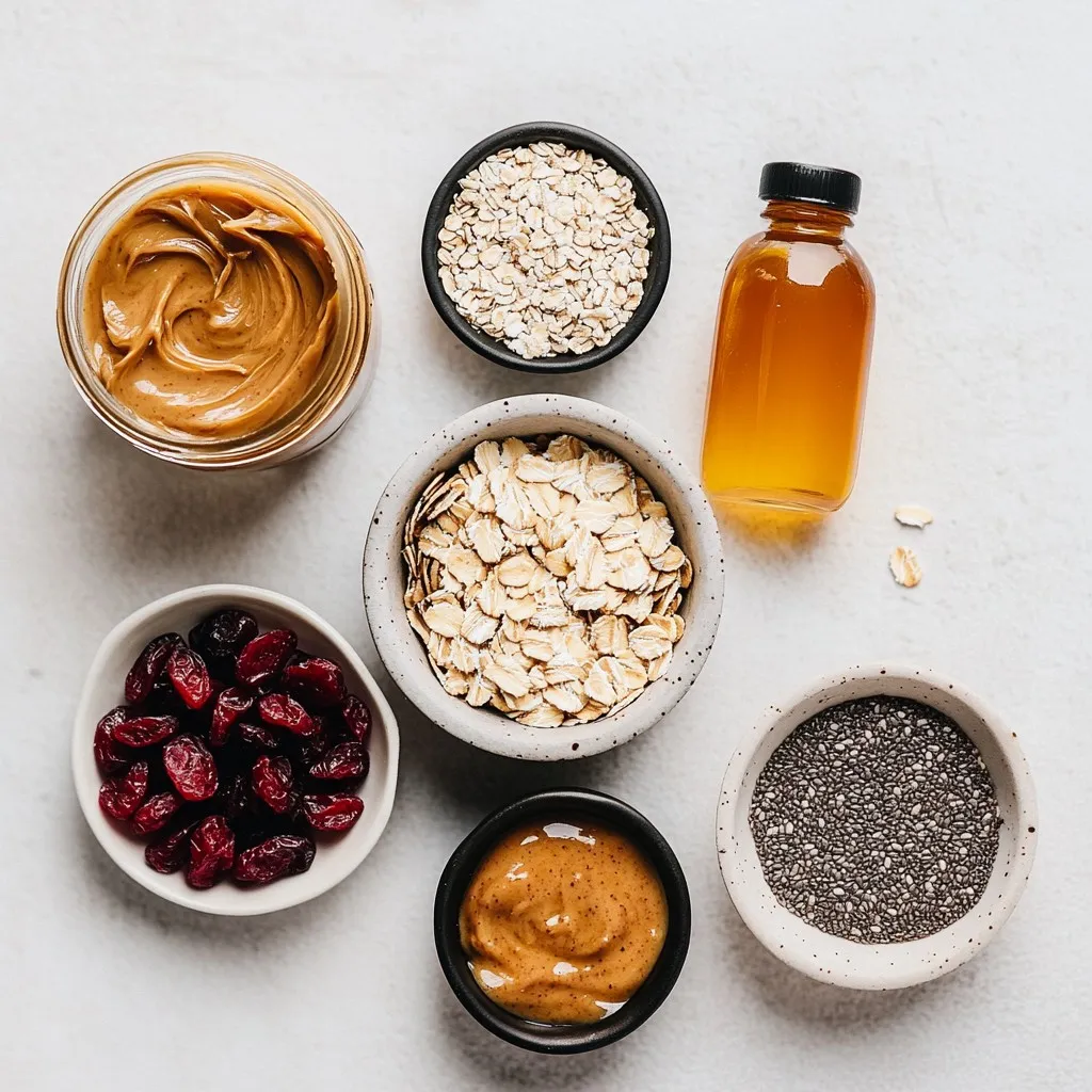 These ingredients blend together to create a nutritious, tasty snack. Almond butter provides healthy fats and protein. Rolled oats give a hearty texture and fiber. Dried cranberries add a sweet and tangy flavor. Honey or maple syrup sweetens the mix naturally. Unsweetened coconut flakes bring a tropical twist. Chia seeds boost the nutrition with omega-3s. Pure vanilla extract adds a warm, inviting aroma. Fine sea salt enhances all the flavors, making every bite delightful.