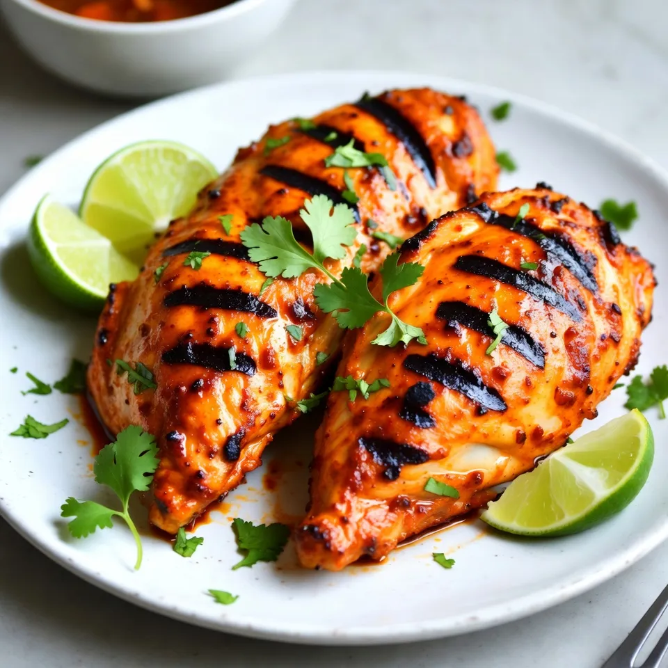 Preheat your grill to medium-high heat. Brush the grill grates with oil to prevent sticking. Take the chicken from the marinade. Let the extra marinade drip off and discard it. Place the chicken on the grill. Grill each side for about 6 to 7 minutes. You want the internal temperature to reach 165°F. Look for nice grill marks on the chicken. Once done, move the chicken to a clean plate. Let it rest for 5 minutes to keep it juicy. Slice the chicken or keep it whole. Garnish with fresh cilantro and serve with lime wedges. Enjoy your meal!