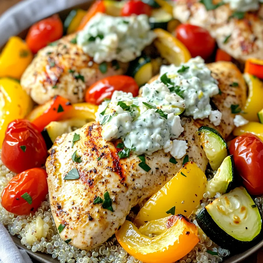 Once done, take the pan out of the oven. Let it cool for a few minutes. This helps the flavors settle. Now, grab your serving bowls. Add a scoop of cooked quinoa or couscous to each bowl. Top with roasted chicken and the colorful veggies. For the final touch, sprinkle crumbled feta cheese and fresh parsley on top. Serve with a dollop of tzatziki sauce. Enjoy your flavorful feast!