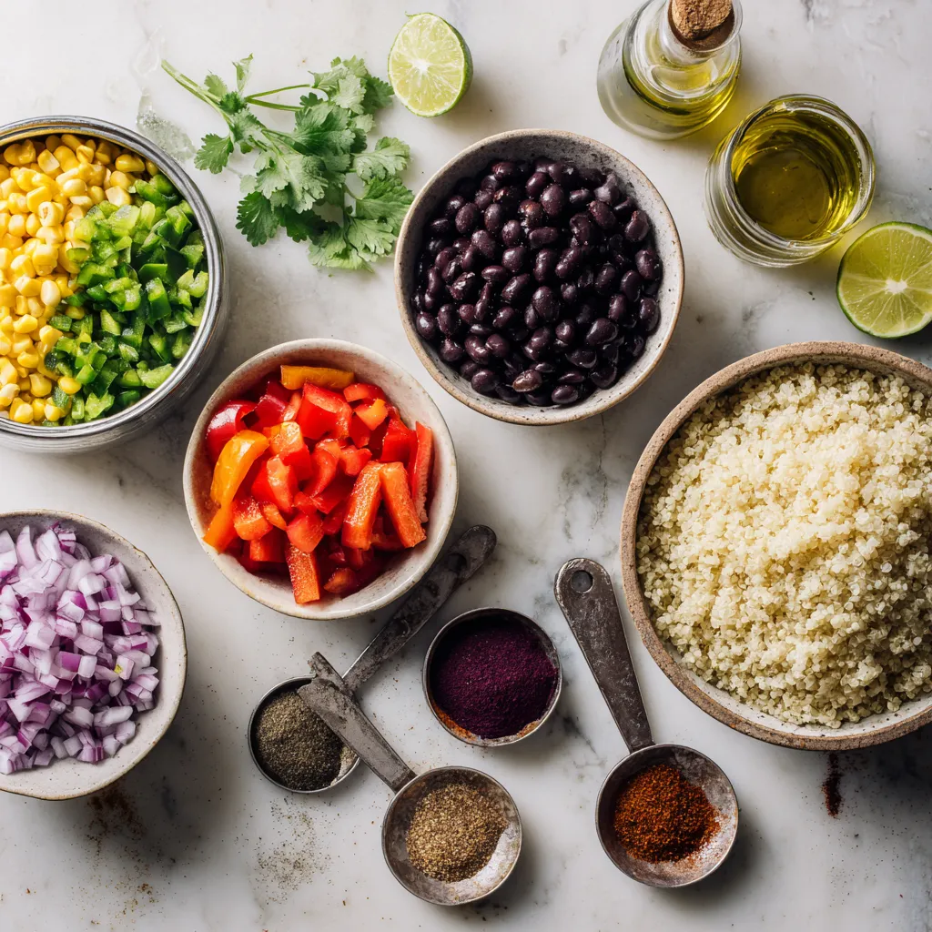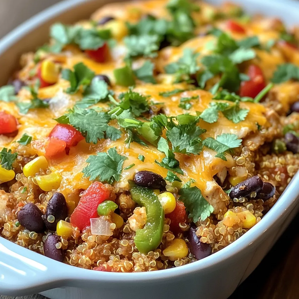 - 1 cup quinoa, thoroughly rinsed and drained - 1 lb chicken breast, cooked and shredded (you can use rotisserie chicken for convenience) - 1 can (15 oz) black beans, rinsed and drained - 1 cup corn (fresh or frozen, thawed if frozen) In this dish, quinoa serves as a hearty base. I love using it because it’s full of protein and fiber. The chicken gives it flavor and makes it filling. Black beans add extra protein and texture while corn brings a sweet crunch. - 1 teaspoon ground cumin - 1 teaspoon chili powder - ½ teaspoon smoked paprika - 1 ½ cups shredded cheese (cheddar or Monterey Jack recommended) The spices are key to making this bake pop! The cumin and chili give warmth, while smoked paprika adds a unique depth of flavor. Cheese is the final touch that makes it creamy and delicious. - ¼ cup fresh cilantro, chopped (for garnish) - 2 tablespoons lime juice - Additional toppings Garnishing with fresh cilantro and a squeeze of lime enhances the flavors. It adds freshness and brightness to each bite. You can also get creative with toppings like avocado or sour cream! {{ingredient_image_2}} First, preheat your oven to 375°F (190°C). This ensures that the heat is ready when you bake. Next, cook the quinoa. In a medium saucepan, mix 1 cup of rinsed quinoa with 2 cups of chicken broth. Bring this mix to a boil over medium-high heat. Once boiling, lower the heat, cover, and let it simmer for 15 to 20 minutes. The quinoa will become fluffy and absorb all the liquid. After cooking, remove it from the heat and let it cool slightly. Now, let’s sauté the vegetables. In a large skillet, add 2 tablespoons of olive oil over medium heat. Once hot, add ½ cup of finely chopped red onion and 1 diced red bell pepper. Sauté for about 5 minutes, stirring often. You want the onion and bell pepper to soften and smell great. In a large mixing bowl, combine the cooked quinoa, 1 pound of shredded chicken, 1 can of rinsed black beans, and 1 cup of corn. Add the sautéed vegetables to the mix. Then, squeeze in the juice of 1 lime and add 1 teaspoon each of ground cumin, chili powder, and ½ teaspoon of smoked paprika. Season with salt and pepper to taste. Stir everything together until well mixed. For baking, lightly grease a 9x13 inch baking dish with cooking spray or more olive oil. Transfer the quinoa mixture into the dish, spreading it evenly. Top it off with 1 ½ cups of shredded cheese, making sure it covers the mixture well. Place the dish in your preheated oven. Bake for 20 to 25 minutes. You’ll know it’s ready when the cheese is melted, bubbly, and has a nice golden color. Enjoy the aroma as it fills your kitchen! To make your quinoa fluffy, rinse it well. Rinsing removes the bitter coating called saponin. This small step makes a big difference in taste. Cook quinoa in chicken broth, as it adds flavor. Bring it to a boil, then lower the heat and cover. Let it simmer for around 15-20 minutes. When done, fluff it with a fork. Seasoning plays a key role in this dish. Use ground cumin, chili powder, and smoked paprika for rich flavors. Don’t skip salt and pepper; they enhance all other tastes. Lime juice brightens the dish and adds a fresh kick. Adjust seasoning to your preference as you mix. Using rotisserie chicken can save you time. It’s already cooked and ready to shred. This cuts cooking time and makes prep easy. You can also prep ingredients in advance. Chop vegetables the day before. Store them in the fridge to save time on baking day. Pre-cook the quinoa ahead of time for even faster assembly. For serving, you have a few fun options. You can serve the Southwest Chicken Quinoa Bake straight from the baking dish. This gives a cozy, rustic vibe. If you prefer, plate individual portions on colorful dinner plates. Add a lime wedge to each plate for a pop of color. This also invites guests to squeeze fresh lime over their serving, enhancing the dish's flavor. Pro Tips Use Rotisserie Chicken: For a quicker prep, using rotisserie chicken not only saves time but also adds extra flavor to your dish. Customize Your Veggies: Feel free to mix and match vegetables based on your preference or what's in season. Zucchini or spinach can be great additions! Cheese Variations: Experiment with different cheese types like pepper jack for added spice or feta for a tangy twist. Make Ahead: You can prepare this dish a day in advance. Just store it in the fridge before baking, and it can be a convenient meal option! {{image_4}} If you want a vegetarian option, skip the chicken. You can use extra beans or tofu instead. This swap keeps protein high while being meat-free. For gluten-free adjustments, check your labels. Most quinoa is gluten-free, but some added ingredients might not be. Opt for gluten-free broth and beans to play it safe. To change the flavor, add different vegetables to the mix. Zucchini, spinach, or even diced tomatoes work well. This makes each bite exciting and fresh. You can also adjust the spice level. If you like it hot, add more chili powder or jalapeños. For a milder taste, reduce the spices or skip them altogether. If you want alternative proteins, try shredded beef or turkey. This makes the dish unique while still giving it a hearty feel. You can also switch up the beans or grains. Use pinto beans or lentils instead of black beans. Or, swap quinoa for brown rice or farro for a different texture. After you enjoy your Southwest Chicken Quinoa Bake, store any leftovers in the fridge. Use an airtight container to keep it fresh. This dish stays tasty for about 3 to 4 days in the fridge. Make sure to let it cool before sealing it up. This helps prevent moisture buildup, which can affect the texture. If you want to save your quinoa bake for later, freezing works great. Allow the dish to cool completely before freezing. Portion it into smaller containers for easy reheating. Use freezer-safe containers or heavy-duty freezer bags. Label them with the date so you know when to use them. Your 