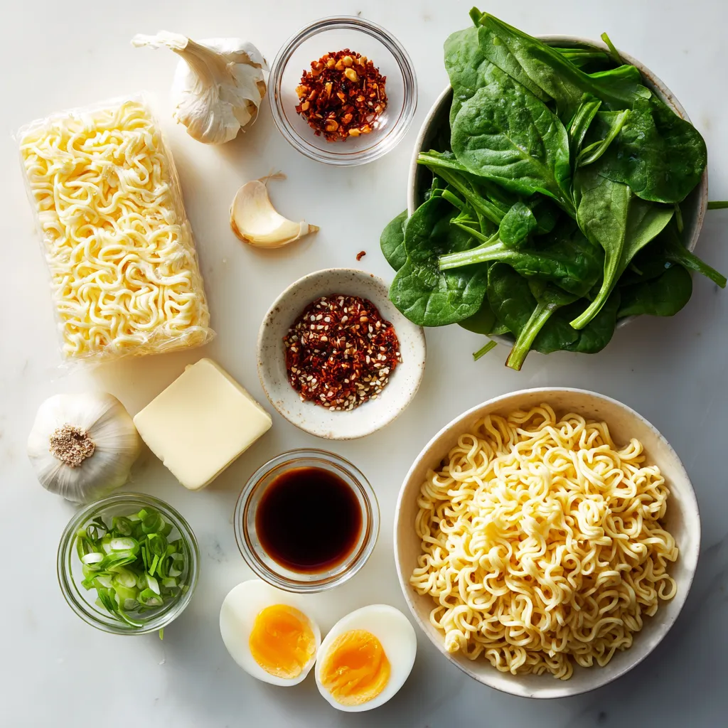 For this dish, I love using instant ramen noodles. They cook quickly and soak up flavors well. You will need unsalted butter to create a rich base. Fresh garlic adds a punch to the dish. The red pepper flakes give it a spicy kick, so adjust to your taste.