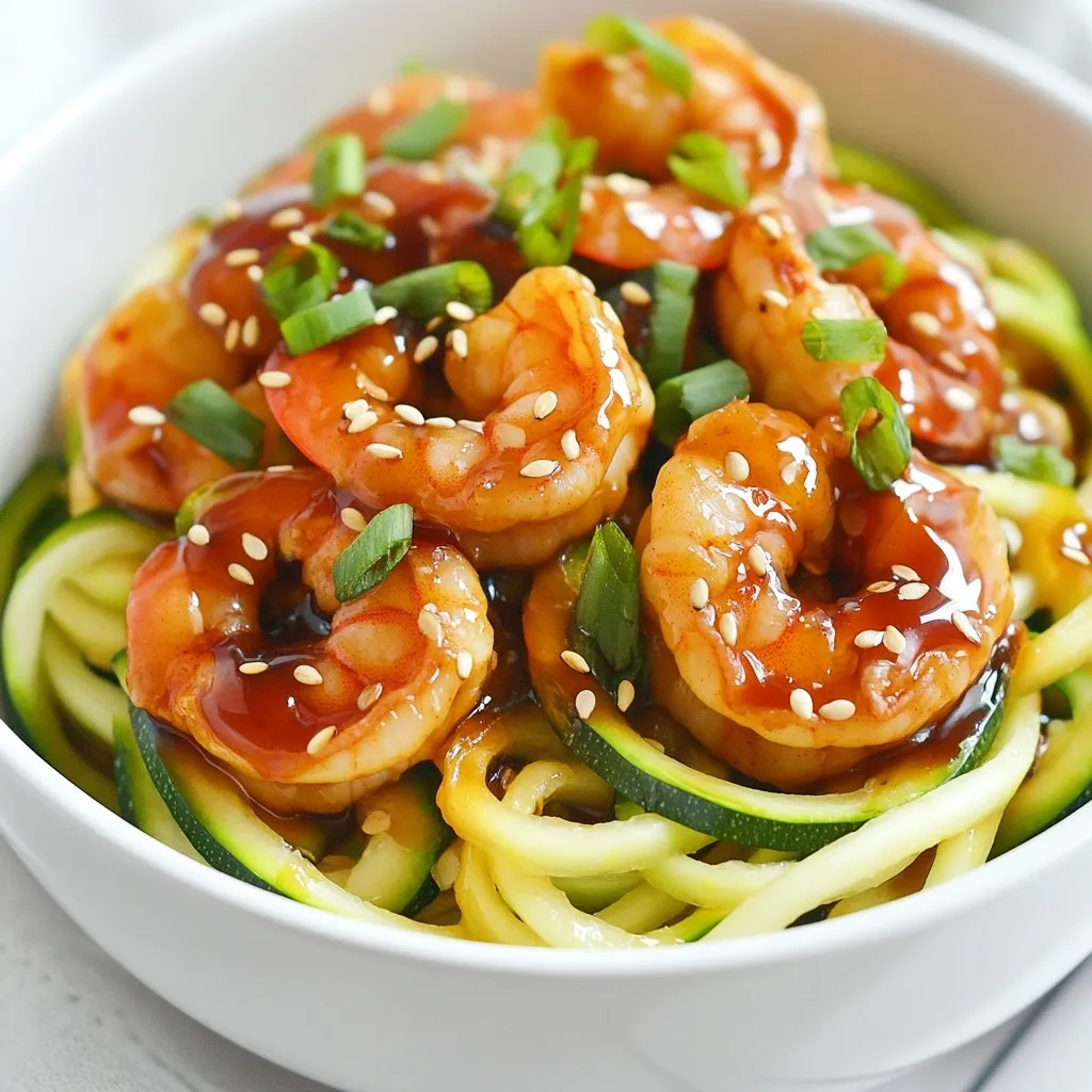 A healthy and delicious dish featuring shrimp and zucchini noodles tossed in a flavorful teriyaki sauce.