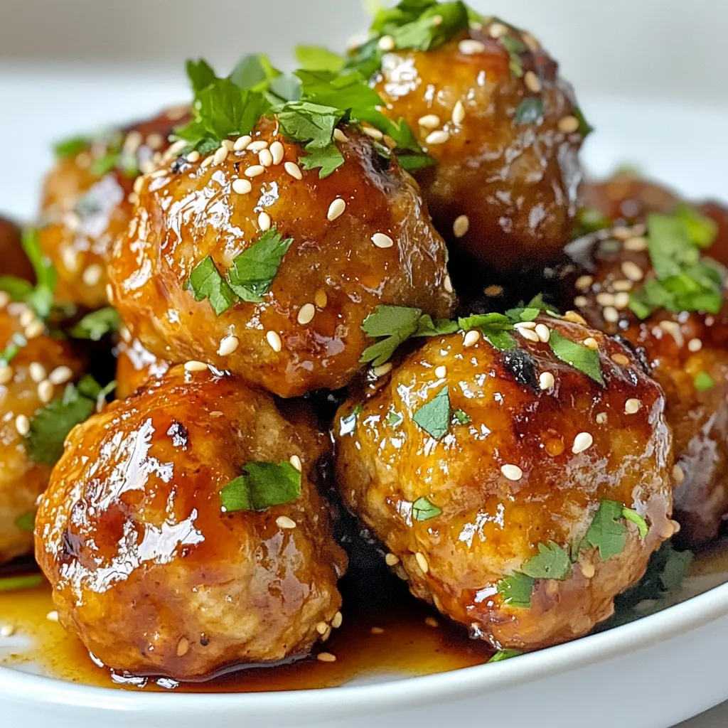- 1 lb ground turkey - ½ cup breadcrumbs (preferably panko for extra crunch) - ¼ cup green onions, finely chopped - 2 cloves garlic, minced - 1 tablespoon fresh ginger, grated - 1 egg, beaten - ¼ cup low-sodium soy sauce - 3 tablespoons honey - 1 tablespoon rice vinegar - 1 tablespoon sesame oil These ingredients create a flavorful base for the meatballs. Ground turkey keeps them lean and moist. Panko breadcrumbs add great texture. The green onions, garlic, and ginger bring fresh flavors that make each bite tasty. - Sesame seeds, for garnish - Fresh cilantro leaves, for garnish Garnishes add a fun look and enhance flavor. Sesame seeds give a nice crunch. Fresh cilantro adds brightness. You can skip these if you want, but they really make the dish pop. - Baking sheet - Parchment paper - Large mixing bowl - Medium bowl for the glaze - Whisk or spoon for mixing Using these tools makes cooking easy. The baking sheet and parchment paper help with cleanup. Mixing bowls let you combine flavors well. A whisk or spoon helps blend the glaze smoothly. Enjoy creating your Teriyaki Turkey Meatballs! {{ingredient_image_2}} First, preheat your oven to 400°F (200°C). This step helps the meatballs cook evenly. Next, line a baking sheet with parchment paper. This makes cleanup easy and prevents sticking. In a large bowl, add the ground turkey, breadcrumbs, green onions, garlic, ginger, and the beaten egg. Mix well with your hands or a spatula. Ensure all ingredients blend together nicely. This blend gives the meatballs flavor and texture. Now, take a small amount of the mixture in your hands. Shape it into a ball, about 1 inch in diameter. Place each meatball on the baking sheet, leaving space between them. This helps them cook evenly without touching. In a medium bowl, whisk together the soy sauce, honey, rice vinegar, and sesame oil. Mix until smooth. This glaze adds a tasty shine and sweet flavor to the meatballs. Put the baking sheet in your preheated oven. Bake the meatballs for about 20 minutes. They should be golden brown and cooked through. After baking, brush half of the teriyaki glaze on top of the meatballs. Once the meatballs are glazed, return them to the oven for another 5 minutes. This caramelizes the glaze and enhances the flavor. After that, let them cool for a few minutes. Serve the meatballs on a platter with sesame seeds and cilantro on top for a fresh touch. Enjoy with rice and veggies for a complete meal. To make juicy meatballs, always use ground turkey with some fat. Lean turkey can dry out. Mixing in breadcrumbs helps keep moisture. You can also add a bit of milk for extra softness. To avoid dryness, do not overcook your meatballs. Use a meat thermometer to check if they reach 165°F. Baking for 20 minutes usually works well. Also, don’t forget to toss them in the teriyaki glaze after baking. This adds moisture and flavor. You can boost flavor by adding more ingredients. Try mixing in some finely chopped bell peppers or carrots. A dash of chili flakes can add a nice kick. Fresh herbs like basil or cilantro can also brighten the taste. Just be sure to keep the balance right so the meatballs stay tender. Pro Tips Use Fresh Ingredients: Fresh garlic and ginger significantly enhance the flavor of your meatballs. Always opt for fresh over dried when possible. Don't Overmix: When combining ingredients, mix just until combined to keep the meatballs tender. Overmixing can make them tough. Adjust the Sweetness: Depending on your taste, feel free to adjust the amount of honey in the glaze. More honey will result in a sweeter teriyaki flavor. Experiment with Toppings: Try adding different toppings like chopped peanuts or sliced radishes for added texture and flavor contrast! {{image_4}} You can swap ground turkey for other meats. Ground chicken works well and has a similar taste. If you want something different, try ground beef or pork. For a leaner choice, use ground chicken breast. You can even make these meatballs with plant-based meat for a vegetarian option. If you need gluten-free meatballs, use gluten-free breadcrumbs. You can find these at most stores now. Make sure to check the soy sauce too. Use a gluten-free version to keep your dish safe and tasty. Rice vinegar is usually gluten-free, but it’s always good to check labels. The teriyaki glaze is key, but you can change it up. For a spicy kick, add sriracha to the glaze. If you like sweet flavors, add pineapple juice. You can also use hoisin sauce for a different taste. Experiment to find what you love best! To keep your leftover meatballs fresh, first let them cool. Place them in an airtight container. They will stay good in the fridge for about three days. If you want them to last longer, consider freezing them. Freezing is a great option for meal prep. To freeze, arrange the meatballs on a baking sheet. Make sure they are not touching each other. Freeze them for about two hours. Once frozen, transfer them to a freezer-safe bag. Be sure to label the bag with the date. They can last up to three months in the freezer. When it's time to enjoy your meatballs again, reheating is easy. For best results, use the oven. Preheat it to 350°F (175°C). Place the meatballs on a baking sheet and cover them with foil. Heat for about 15 minutes or until warm. You can also use the microwave. Just be sure to cover them to keep them moist. Enjoy your savory teriyaki turkey meatballs! Yes, you can make teriyaki turkey meatballs ahead of time. Prepare the meatballs and glaze as instructed. After shaping the meatballs, place them on a baking sheet and freeze them. Once they are frozen, transfer them to a bag. When you are ready to cook, bake them directly from the freezer. Just add a few more minutes to the cooking time. You can serve teriyaki turkey meatballs with many sides. Popular choices include: - Steamed rice - Stir-fried vegetables - Noodles - A fresh salad These options balance the rich flavors of the meatballs. You can also serve th